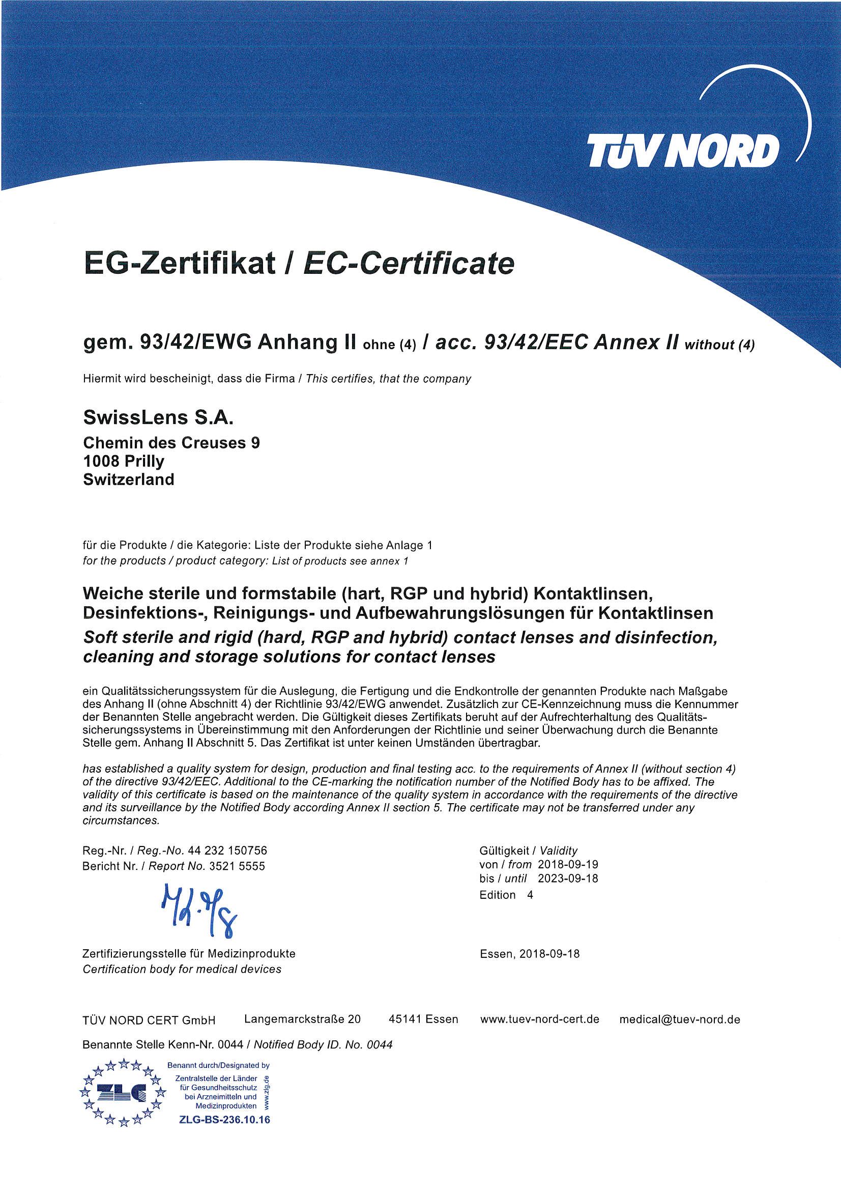 SwissLens dispone de un sistema de Garantía de Calidad conforme a los requisitos de la norma ISO 13485.